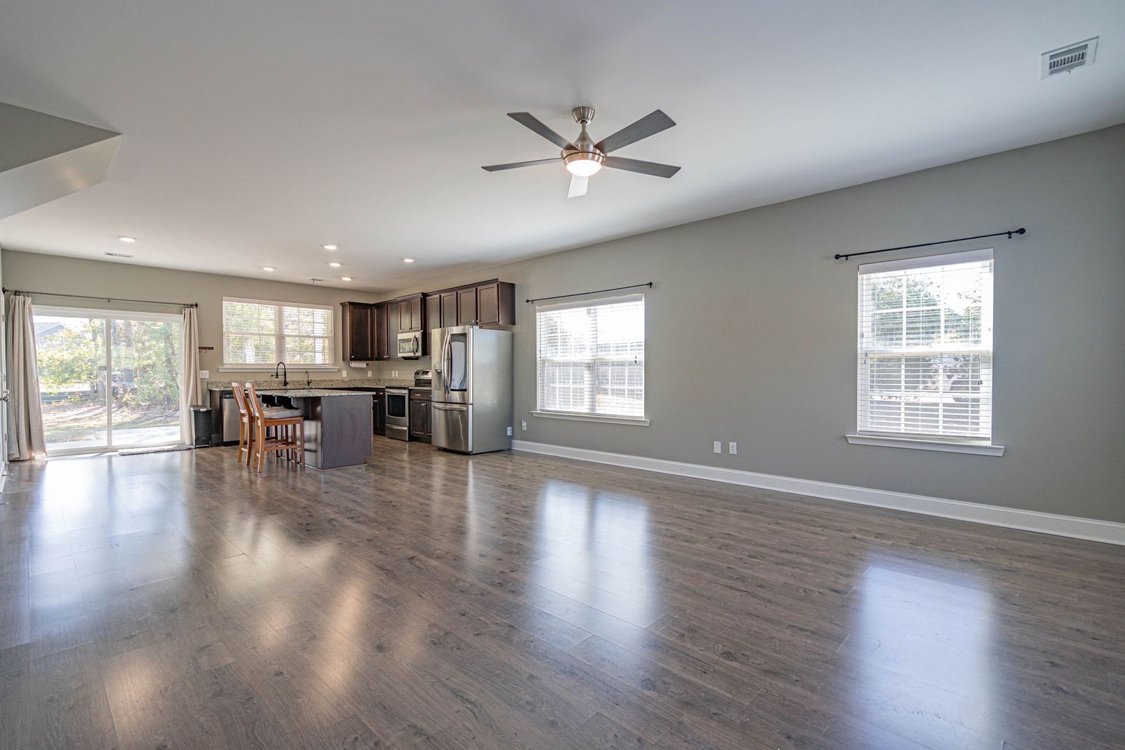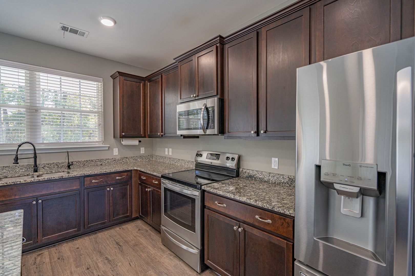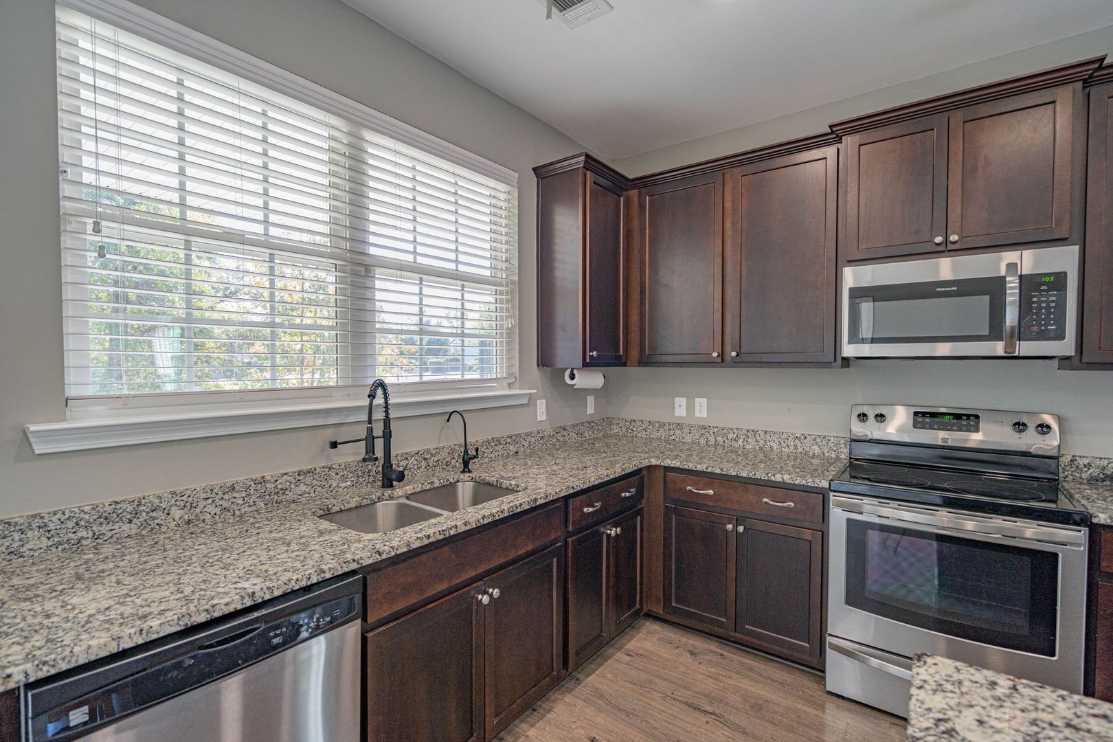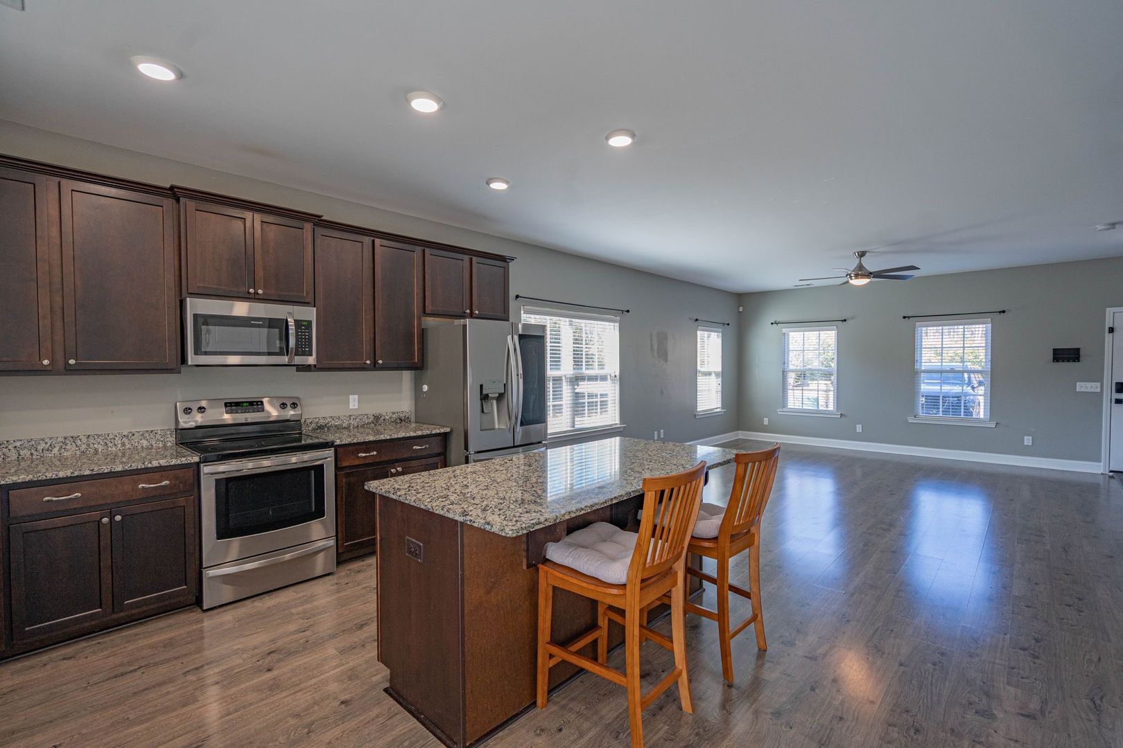 Well-maintained 3-bedroom, 2.5-bath end-unit townhome in Parkview Townhomes. Features a spacious, open-concept main level with wood-inspired flooring. The kitchen offers recessed lighting, a large center island, pantry, and direct access to the backyard. All bedrooms are located upstairs, including the primary suite with double vanity, soaking tub/shower combination, and generously sized closet. Rear yard backs to a wooded buffer and includes a patio ideal for grilling or relaxing. No smoking. Pets negotiable. Available now!